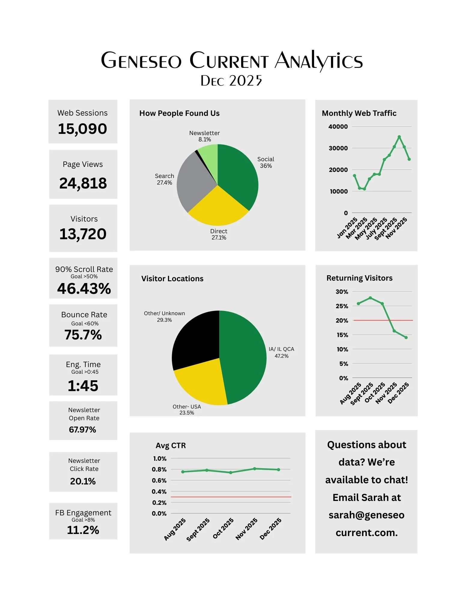 At The Current, we connect local businesses with the people who live, work, and spend right here in our community. With a loyal audience across print, digital, email, and social media, we help you get your message in front of thousands of engaged readers every month. Whether you’re looking to boost sales, build brand awareness, or promote a special event, we create advertising opportunities that deliver real results — and keep your business top-of-mind in Geneseo and beyond.