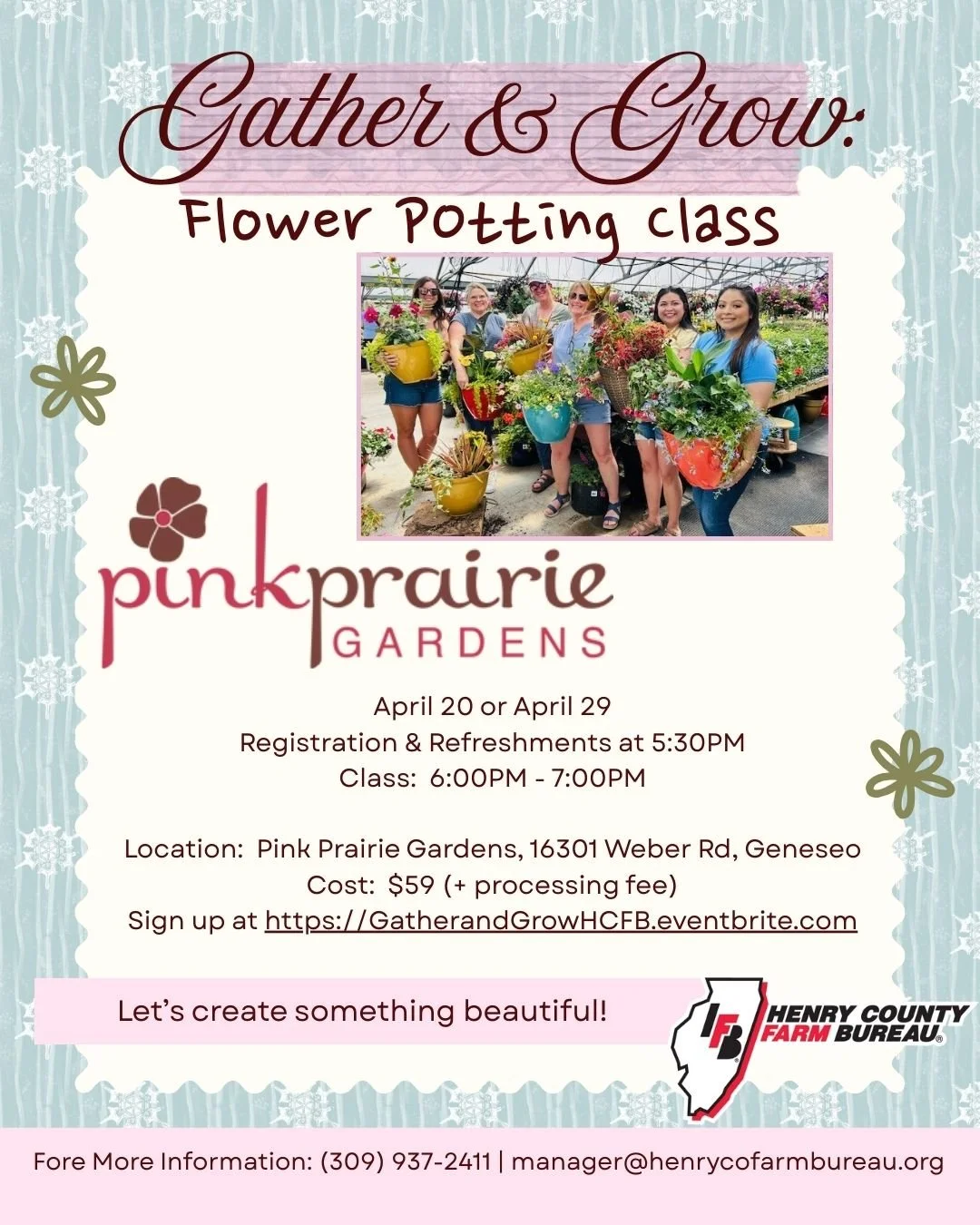 There will be two dates to choose from to attend, Monday, April 20 or Wednesday, April 29. For each class, registration will begin at 5:30pm and the class will begin at 6:00pm. The cost to attend the class is $59 plus fees, and includes instruction, 16” flower pot with soil and 5 plants that you will choose. Register at https://GatherandGrowHCFB.eventbrite.com. For questions contact the Henry County Farm Bureau at (309) 937-2411 or email manager@henrycofarmbureau.org.