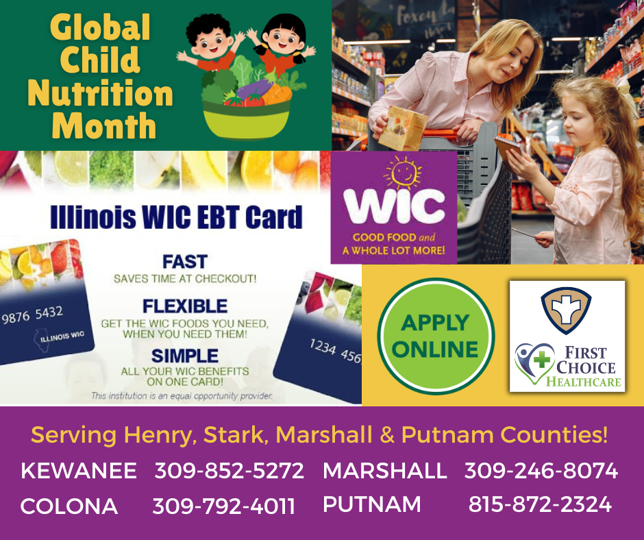 The Henry and Stark County Health Department WIC (Women, Infants and Children) Food Supplemental program staff note that April has been designated Global Child Nutrition Month. Therefore, it’s a great time to remind local residents that the WIC program promotes the health of our local children and mothers, by providing free groceries to participants; and creating healthier families by encouraging healthy eating and lifestyles.