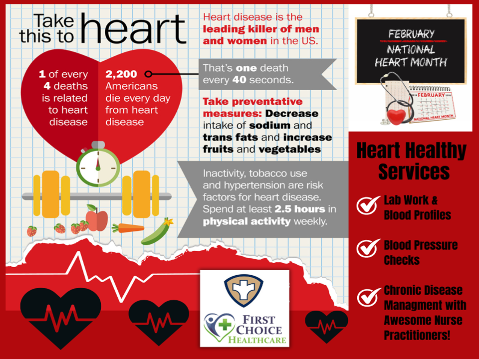 The Henry and Stark County Health Departments and First Choice Healthcare note February has been designated American Heart Month. In accordance with this important health observance; we note that there is good news about heart disease - the number one killer - and that is a healthy heart is within everyone's reach.