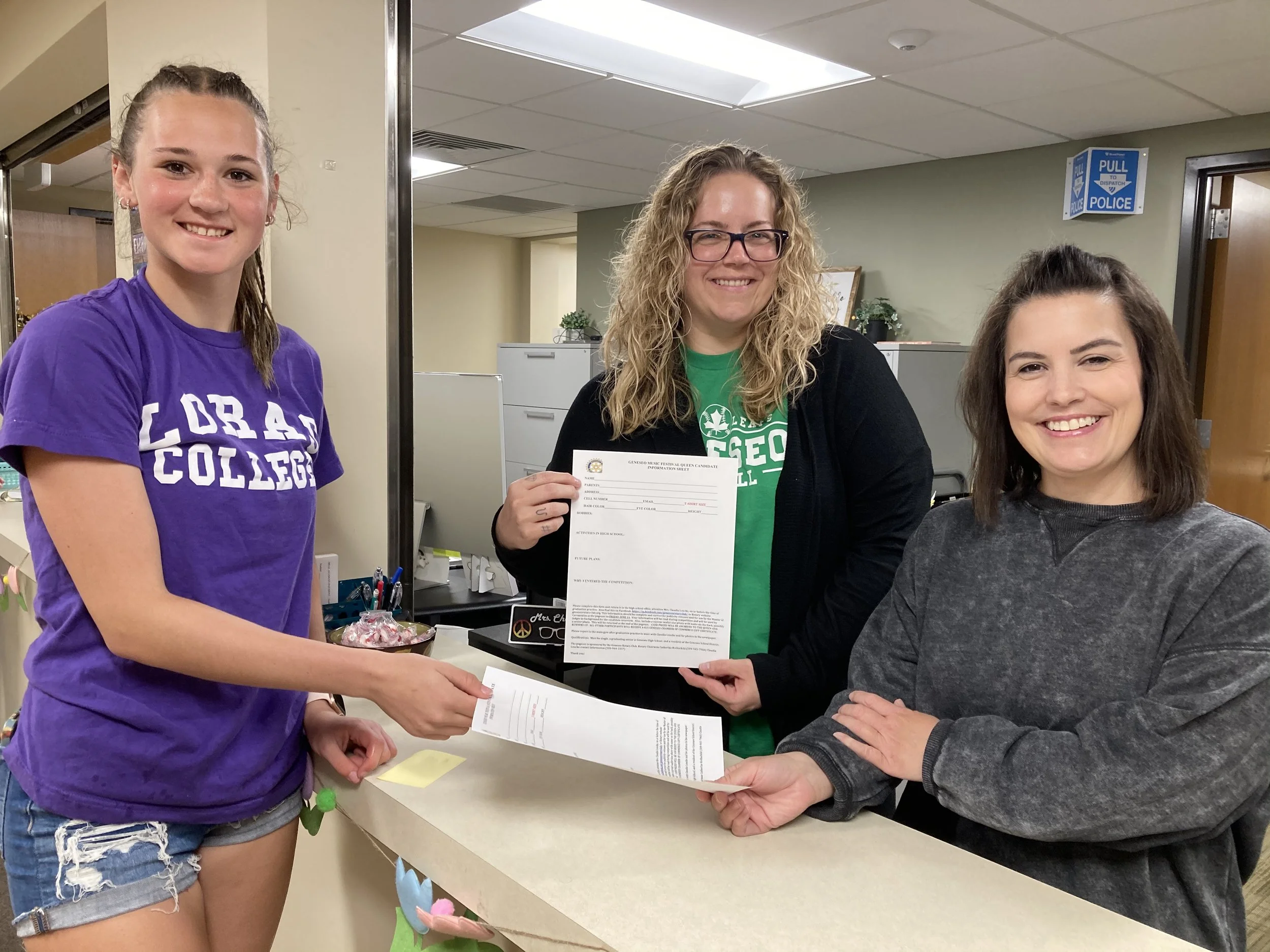 Geneseo High School office staff, Nicole Cherry, center; and Jill Harrington, at right, go over a Geneseo Music Festival queen candidate information sheet with graduating senior Ella Toom, at left. The Geneseo Rotary Club-sponsored pageant is Friday, June 14, in City Park. The pageant is open to GHS graduating seniors and scholarships funds from the Rotary Club will be awarded to the queen and four runners-up. Pageant forms are available in the main office at GHS. For more information, call Catherine Rothschild at 309-945-7966 or Claudia Loucks at 309-714-1366. Photo by Claudia Loucks