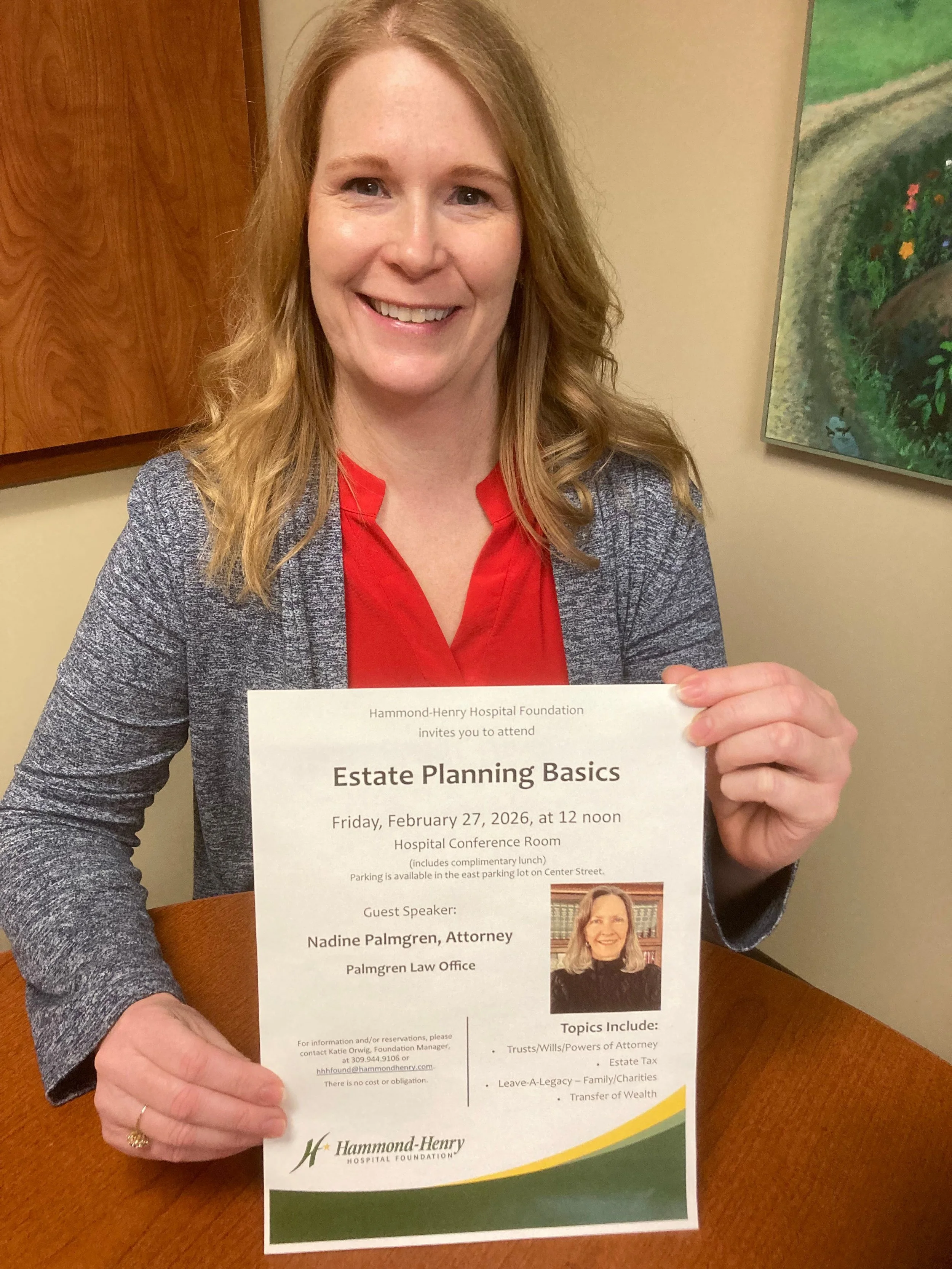 Katie Orwig, Hammond-Henry Hospital Foundation Manager, shows a flyer about the upcoming Estate Planning Basics program scheduled for 12 noon on Friday, Feb. 27, in the Hospital Conference Room.