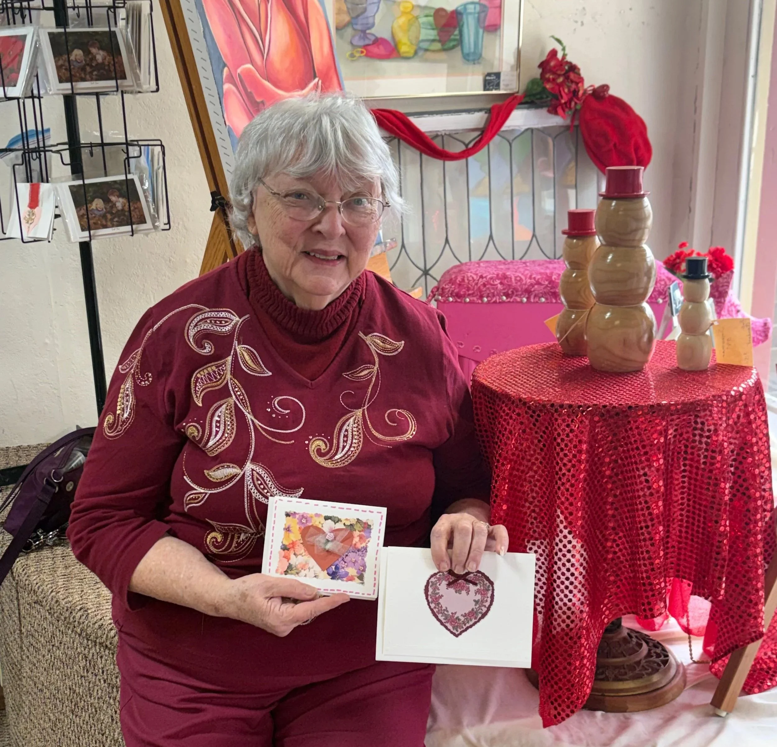 Even though Valentine’s Day 2026 is over, there are still plenty of hearts at RutabagA Art Gallery in downtown Geneseo. The display, with a theme of “Love is in the Air,” includes heart-centered paintings and collages. In the photo, RutabagaA member Joyce Mattan is holding two of the handmade Valentine greeting cards that she created.