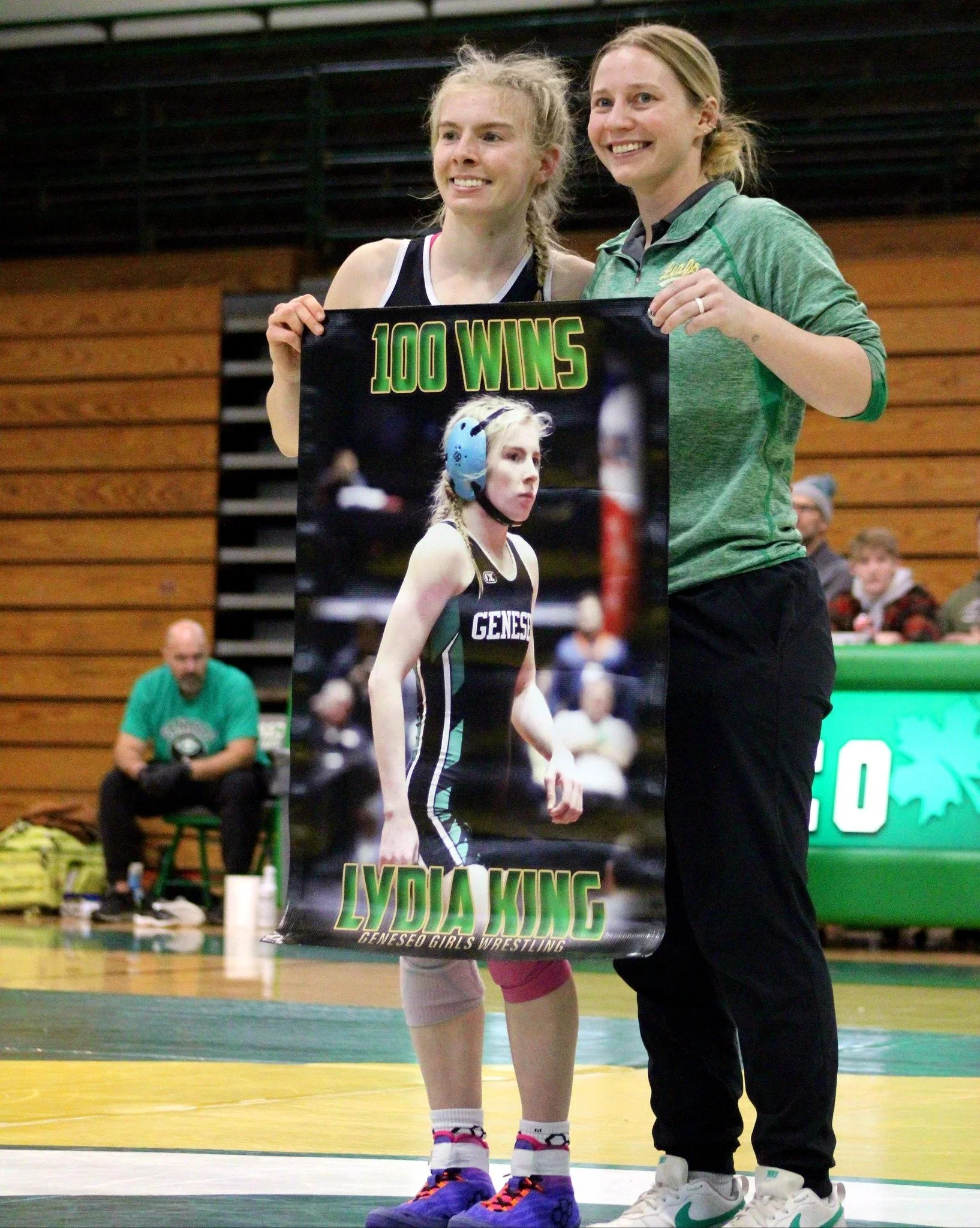 Lydia King made history at Geneseo High School when she reached her 100th win in the Girls’ Wrestling Quad Meet held Jan. 2 in the GHS gym.