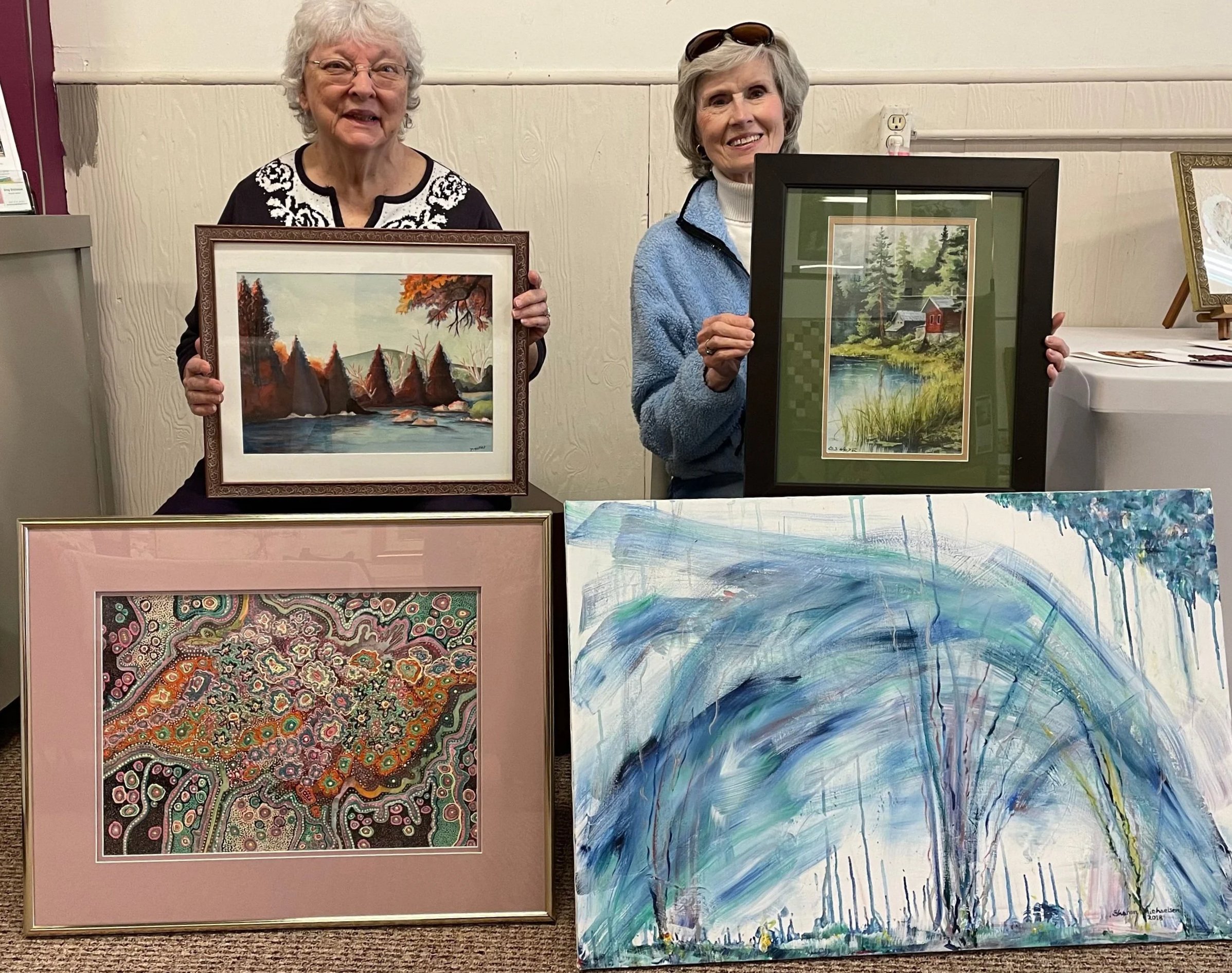 RutabagA Art Gallery members Joyce Mattan, left; and Sharon Michaelsen, are shown with the paintings to be donated to the WQPT Public Broadcasting Fundraising Auction that begins Sunday, March 15, at WQPT’s Facebook Page.