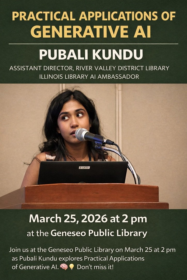 The program will be presented by Pubali Kundu, Assistant Director of the River Valley District Library and Illinois Library AI Ambassador.