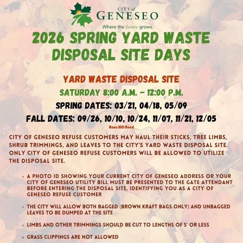 2. Spring Disposal Site Dates are March 21st, April 18th, and May 9th, 8am - 12 Noon. Please see the attached graphic below and visit The City’s website for additional information & details. https://www.cityofgeneseo.com/city-debris-disposal-site/