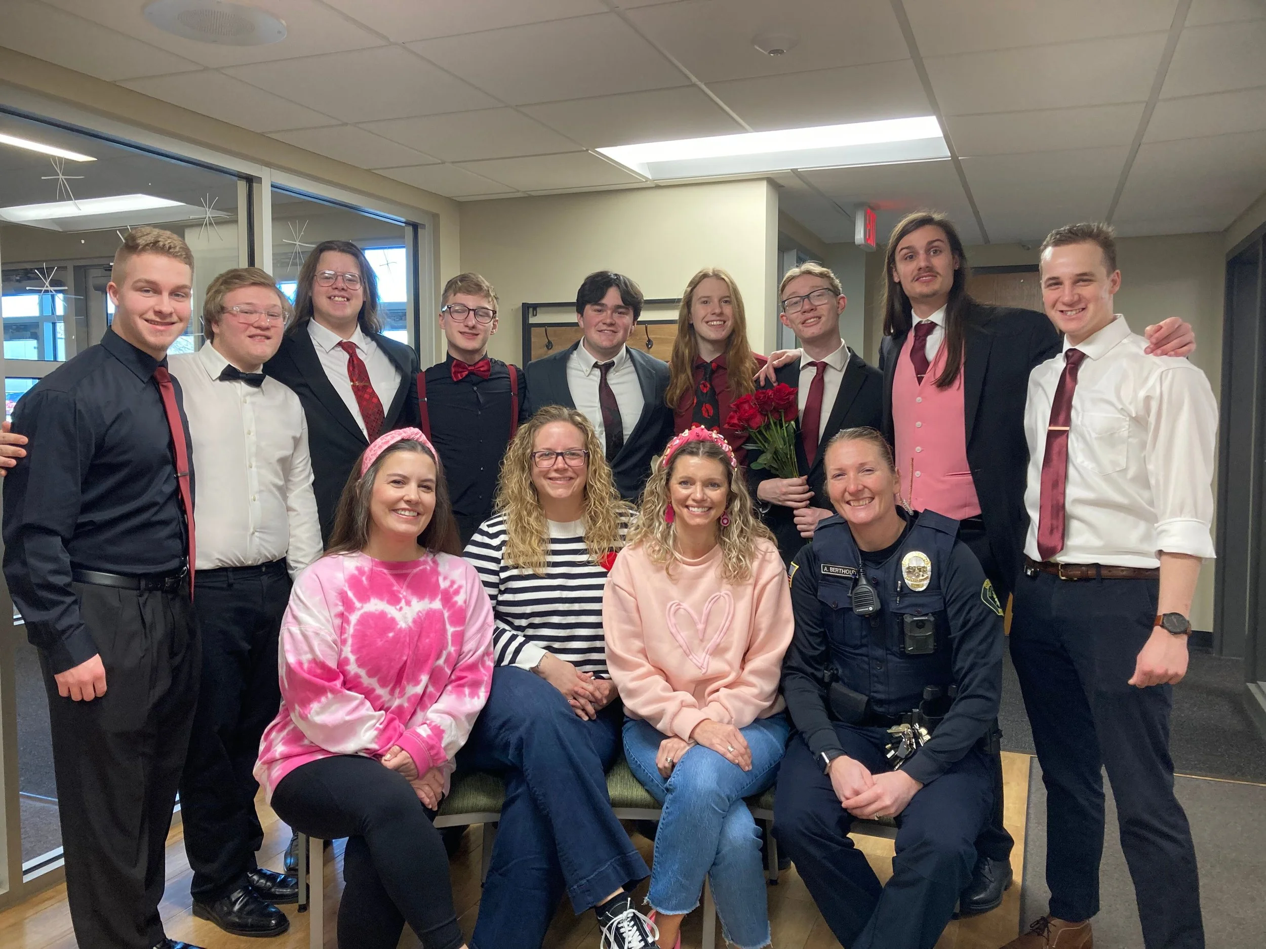 Geneseo High School staff members, from left, Jill Harrington, Nicole Cherry, Amber Dickey and School Resource Officer Amber Berthoud, also received singing telegrams on Feb. 13 from GHS seniors, from left, Landry Possin, Ethan Sundeen, Theodore Phillips, Jameson Coppejans, Cy Sammons, Jack Cooper, Jonathan Freadhoff, Perry Farley, and Matthew Darnall. In addition to the singing telegrams, special deliveries of Crush soda were made to students at Geneseo High School Friday in observance of Valentine’s Day. The cans of soda were delivered “anonymously,” and the recipient was able to return the empty can and pay a minimal fee to Student Council to find out who has a “crush” on them. Tara Laingen and Megan Brewer are the GHS Student Council advisors. Photo by Claudia Loucks